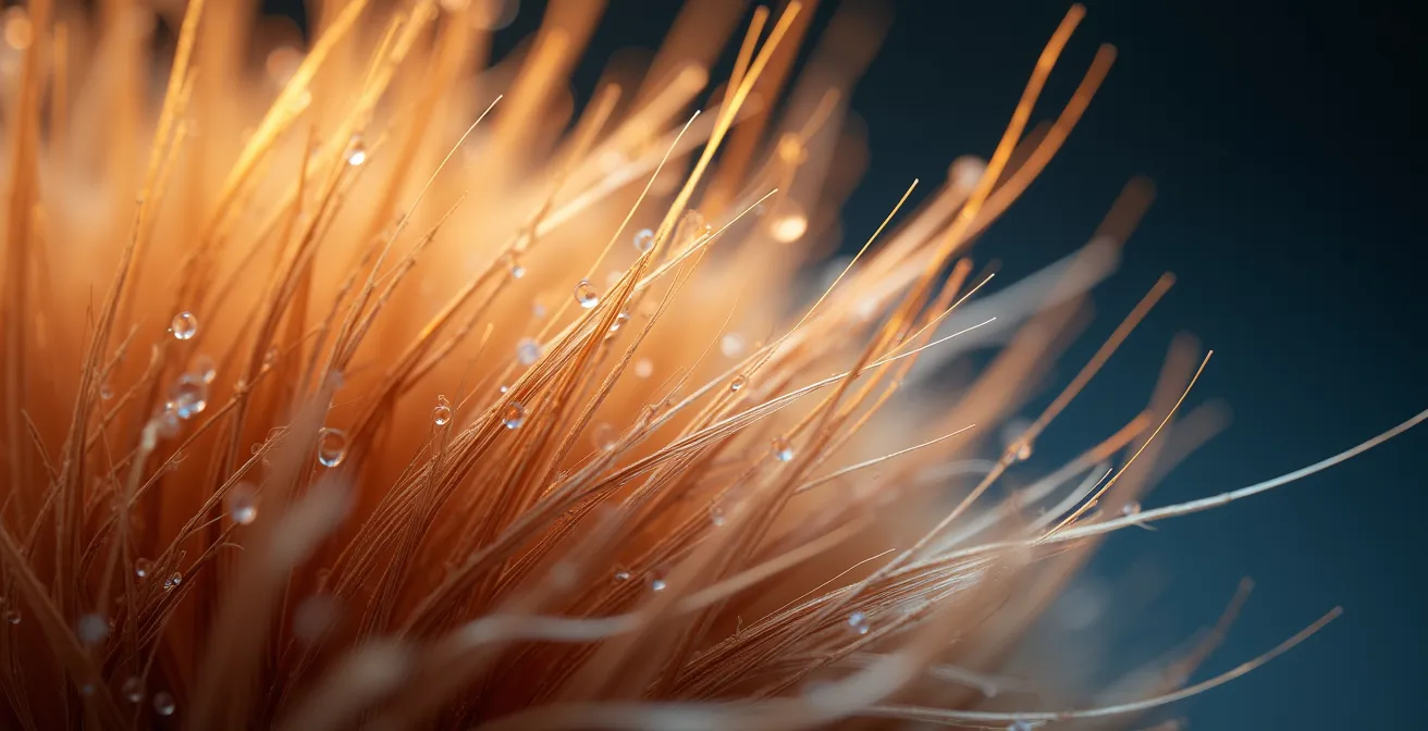 Neben den offensichtlichen Aggressoren wie Hitze und Chemie gibt es eine subtilere, aber ebenso zerstörerische Kraft: die mechanische Abrasion. Dabei handelt es sich um die tägliche, oft unbewusste Abnutzung der Haaroberfläche durch Reibung und Zug. Jeder dieser kleinen Fehler summiert sich im Laufe der Zeit zu erheblichen Schäden an der Schuppenschicht (Cuticula), die das Haar rau, spröde und anfällig für Spliss macht. Nasses Haar ist besonders gefährdet, da Wasser die Keratinstruktur aufquellen lässt und sie um ein Vielfaches empfindlicher macht.